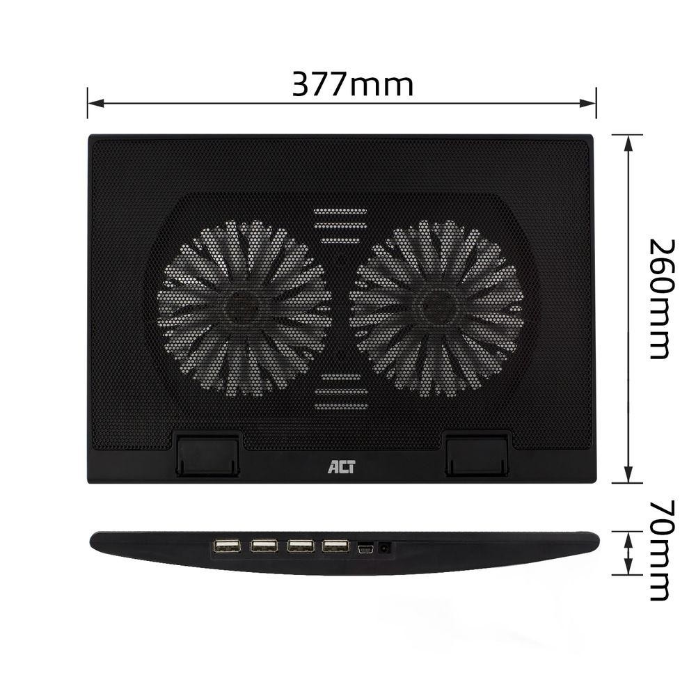Охладител за лаптоп ACT, До 17", С два вентилатора, USB хъб, Черен