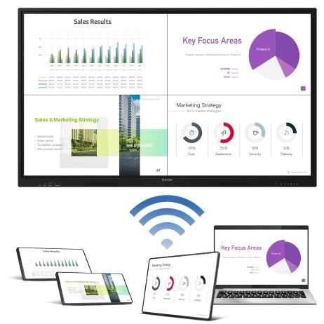 Интерактивният дисплей RICOH A7500 предлага кристално ясно изображение и разнообразие от функции за по-добра комуникация и сътрудничество в екип.
