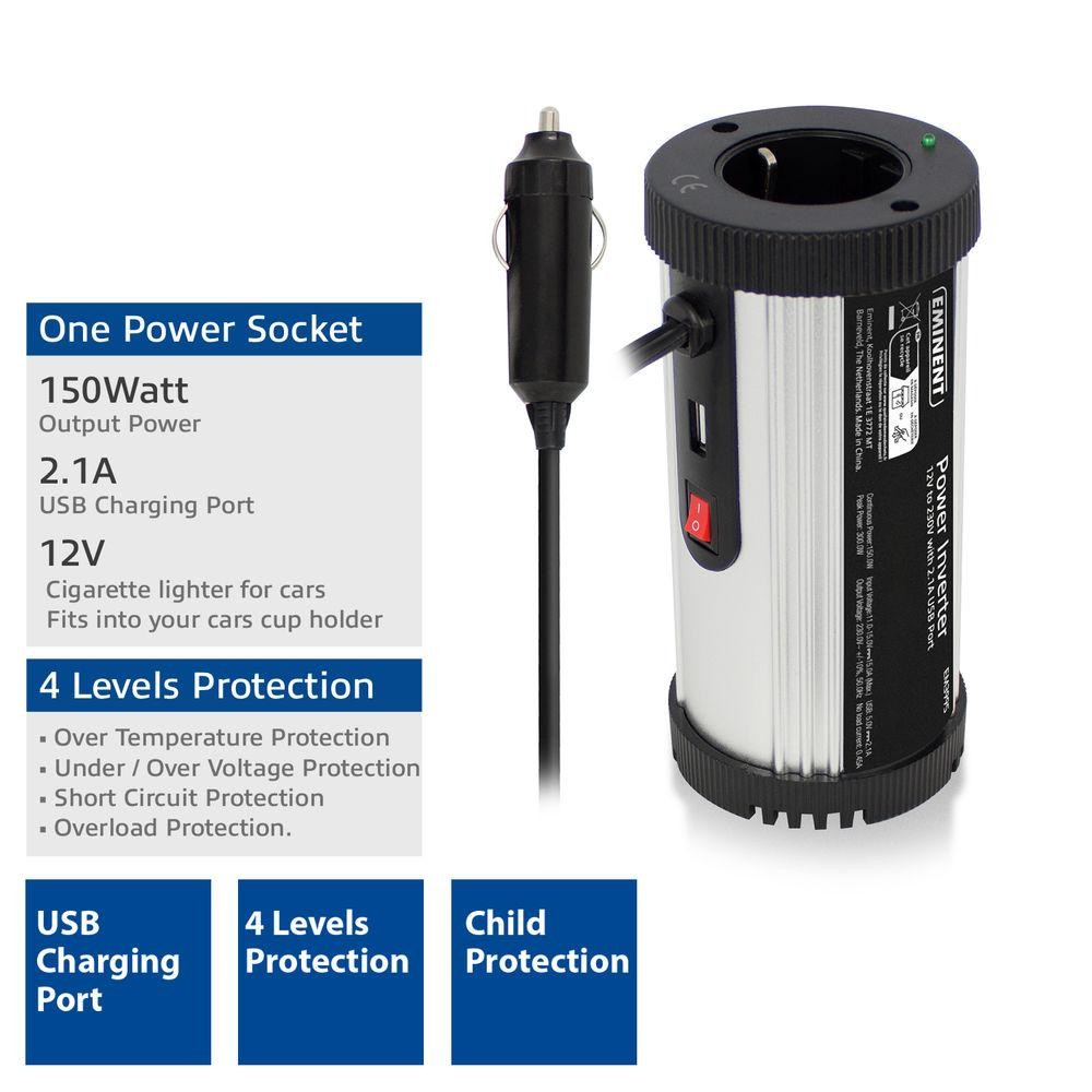 Инвертор Ewent EM3995, DC/AC 12V/230V, 150W, USB 2.1 A, Сребрист