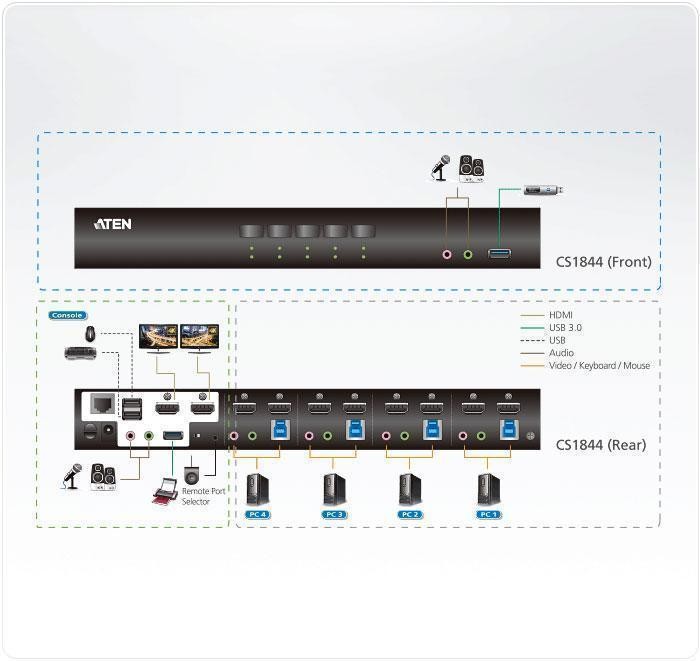 Представяме ви KVM превключвател ATEN CS1844-AT-G, който предлага възможност за управление на до 4 устройства с USB 3.0 интерфейс и поддръжка на 2 HDMI монитора. С него ще подобрите вашата продуктивност и удобство, като намалите кабелния бардак и оптимизирате работния процес.