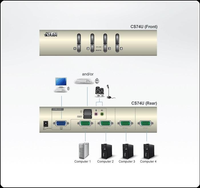 <p>CS74U управлява 4 компютъра с USB интерфейс, VGA видео и звук от една KVM конзола (USB мишка/клавиатура, <br />VGA монитор, слушалки и микрофон).<br />Превключва портовете с хардуерни бутони на предния панел. Лесен за инсталация, не изисква <br />софтуер, стабилен метален корпус, независим от операционната система и компютърната платформа (прехваща клавиатурния вход директно).<br /><br />1 VGA конзола управлява 4 VGA компютъра с USB интерфейс<br />Превключване чрез бутони на предния панел<br />Многоплатформена поддръжка – Windows, Linux и Mac<br />Поддържа звук – full bass response функцията осигурява богато изживяване за 2.1 channel surround sound системи<br />Отлично качество на видеото – 2048 x 1536; DDC2B<br />Поддържа USB hot-plugging<br />Не изисква собствено захранване</p>