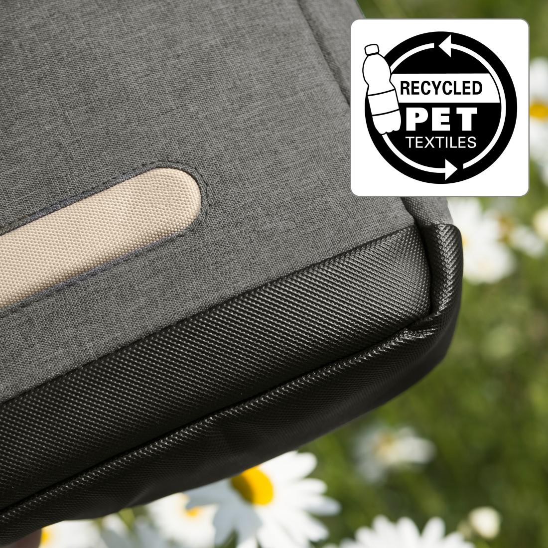 Гамата "Terra" е синоним на устойчиви, висококачествени продукти, които са полезни както за вас, така и за околната среда - Подплатено отделение за лаптоп за надеждна защита при транспортиране - Допълнителен джоб за таблети до 32.77 см (12.9") в основното отделение - Просторен преден джоб за допълнителни аксесоари или лични вещи - Структурата на органайзера в предния джоб улеснява намирането на съхраняваните аксесоари - Подплатена презрамка за удобно носене: може да се сваля и да се регулира дължината - Презрамка за количка за удобно закрепване към дръжката на количка - Закачаща се лента за фиксиране на лаптопа - Водоотблъскващ материал за защита от влага, мръсотия и драскотини