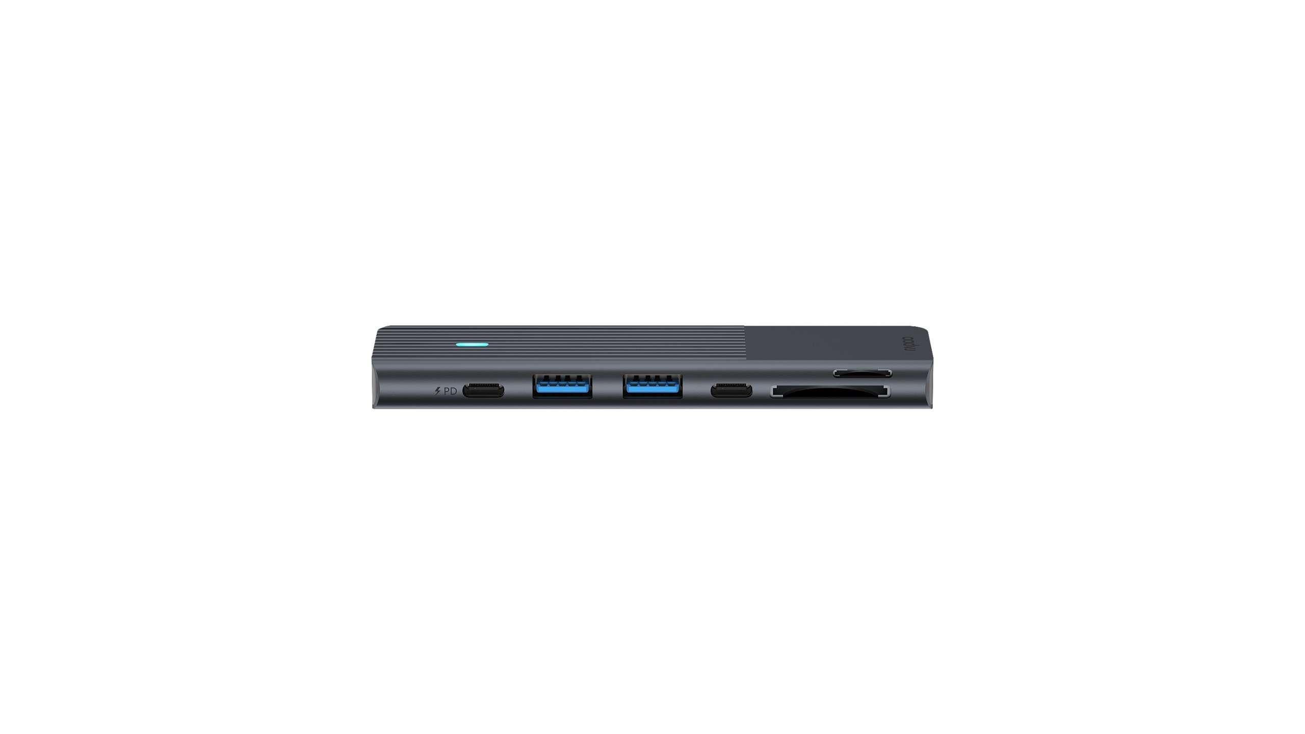 Мултипортовият адаптер Rapoo UCM-2003 ви предлага 7 в 2 възможности за свързване, включително USB-A, USB-C, HDMI, SD и MicroSD слотове. Неговият черен дизайн добавя стил и елегантност към работното ви пространство.